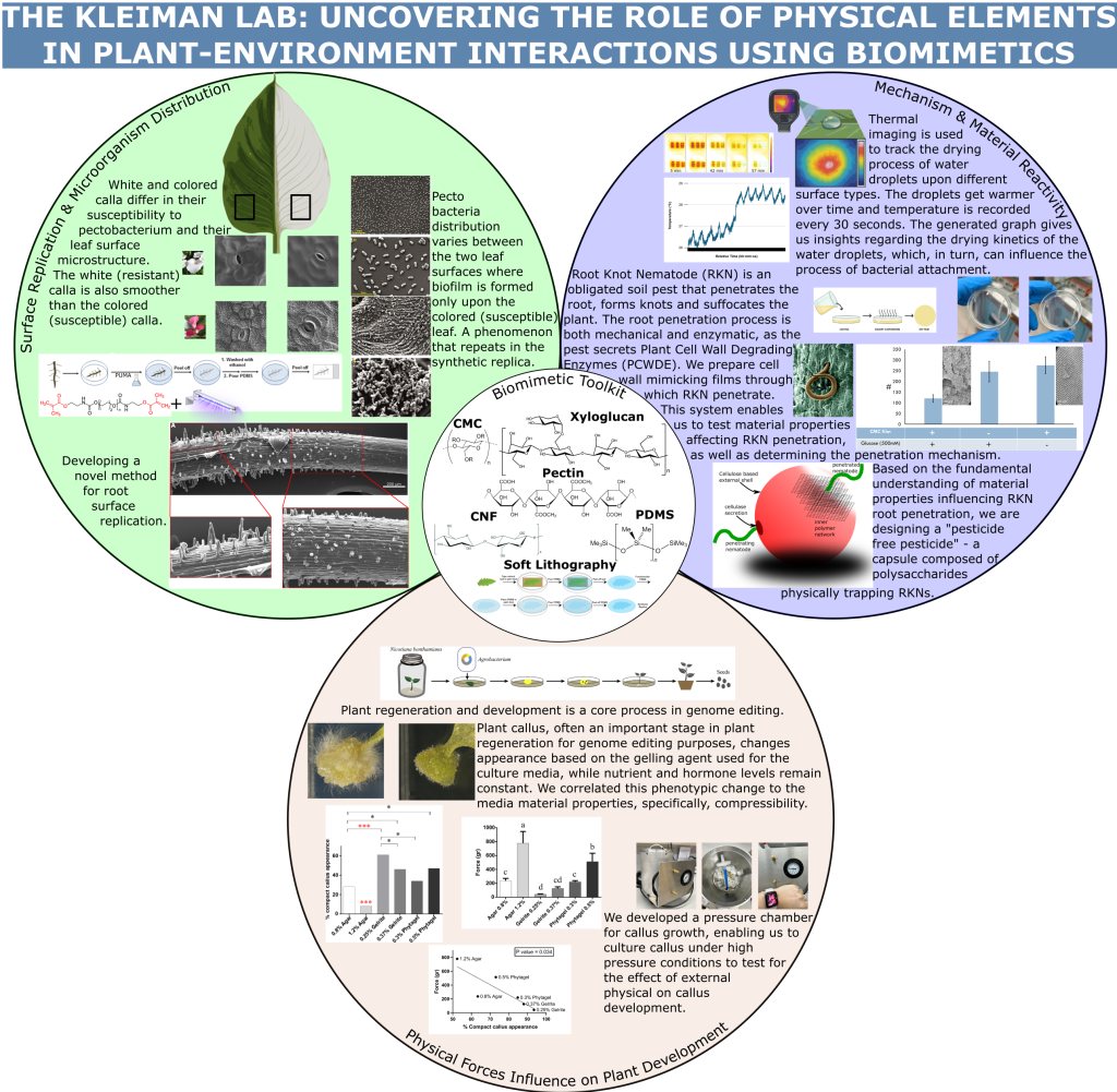 אנו משתמשות במערכות סינתטיות אלו על מנת להבין טוב יותר כיצד אלמנטים פיסיקליים אלה משפיעים על האינטראקציה בין הצמח לסביבתו. לדוגמא, אנו מפתחות מערכות שמחקות את מיקרו מבנה ותכונות החומר של עלים ושורשים על מנת להבין כיצד תכונות אלה משפיעות על פיזור וחדירה של מזיקים כגון חיידקים, פטריות ונמטודות. בנוסף אנו מפתחות מצעים לתרביות תאים, בעלי תכונות חומר שונות, אשר משפיעות על צורת ההתפתחות של הצמח על פני אותם המצעים.